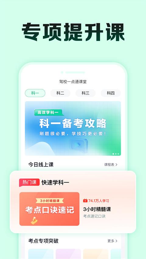 涵盖科目一、科目四的理论知识以及科目二、科目三的实操技能学习,直击考试重点,形式灵活且通俗易懂,助力学员更高效地学习和记忆驾考知识。