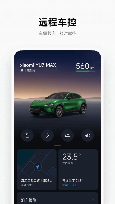 小米汽车app是小米公司推出的综合性智能汽车服务平台,集成了购车咨询、车主社区、车辆控制、在线商城等多项功能。用户可以通过这款应用在线预约看车试驾、查询订单进度、购买汽车配件,并与其他车主交流用车心得。对于小米su7车主来说,这款应用更可提供便捷的充电服务、远程车辆操控、自动泊车辅助等智能功能,为用户打造全方位的汽车购买与使用体验,让汽车生活更加智能化、便捷化和社交化。
