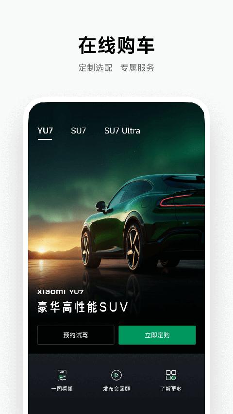 购车:了解小米汽车的核心亮点和技术参数,支持在线预约试驾、配置选购专属座驾,并可实时处理提车相关事宜。